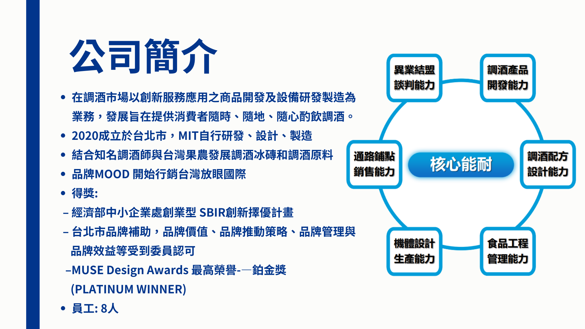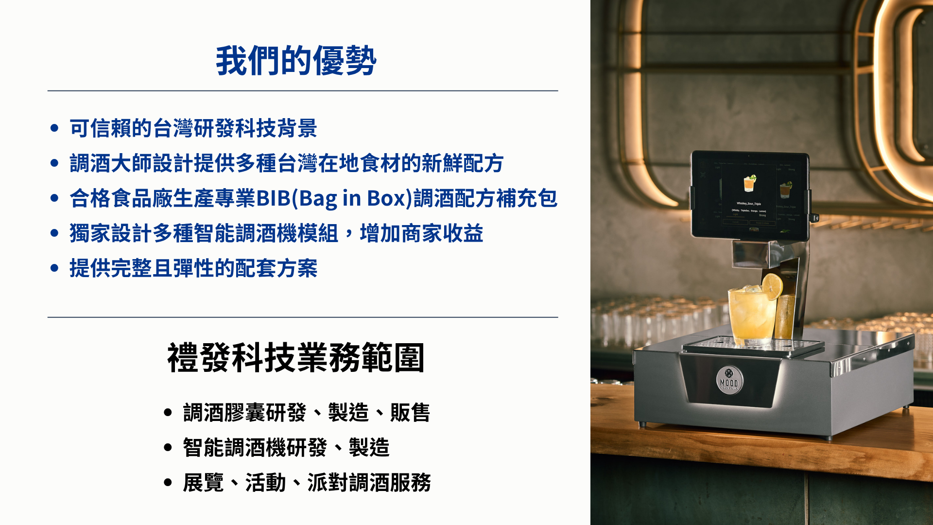 - 在調酒市場以創新服務應用之商品開發及設備研發製造為業務,發展旨在提供消費者隨時、隨地、隨心酌飲調酒。